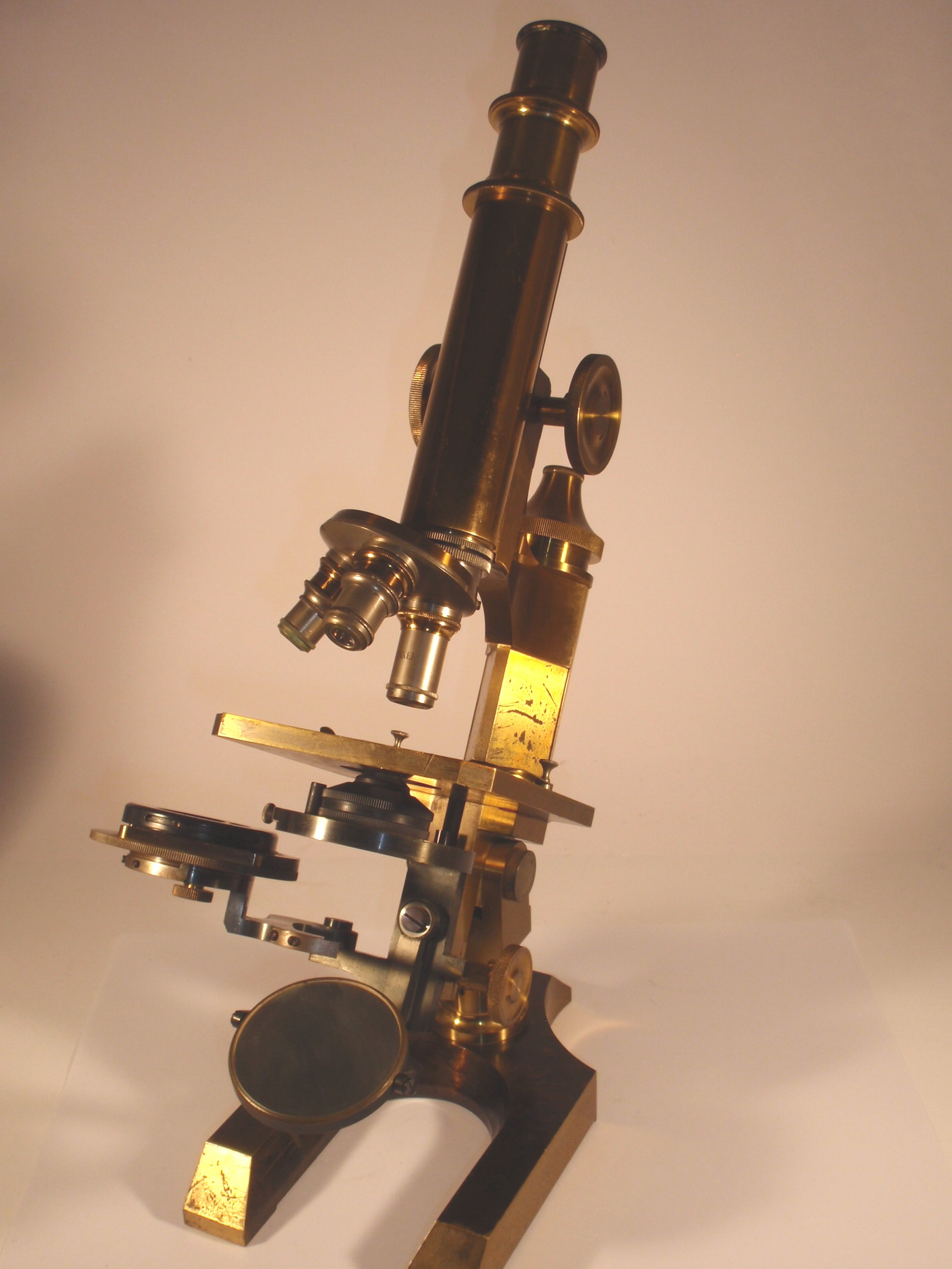 voll Messing, original zaponiert, datiert 1891, Höhe 33 cm, 3 Okulare, 3 signierte und nummerierte Objektive (No. 1, 3 und 5), 3fach-Revolver, Grobeinstellung, Feineinstellung, abfahrbarer und schwenkbarer Kondensor unter dem Tisch, Kippstativ, Signatur mit Angabe des Herstelljahres auf der dem Betrachter zugewandten Seite der Dreikantsäule "No. 1.700 R. Winkel Göttingen 1891"; mechanisch und optisch gut bis sehr gut, Erhaltung gut; der Fuß ist original punziert, sehr schöner Kasten!